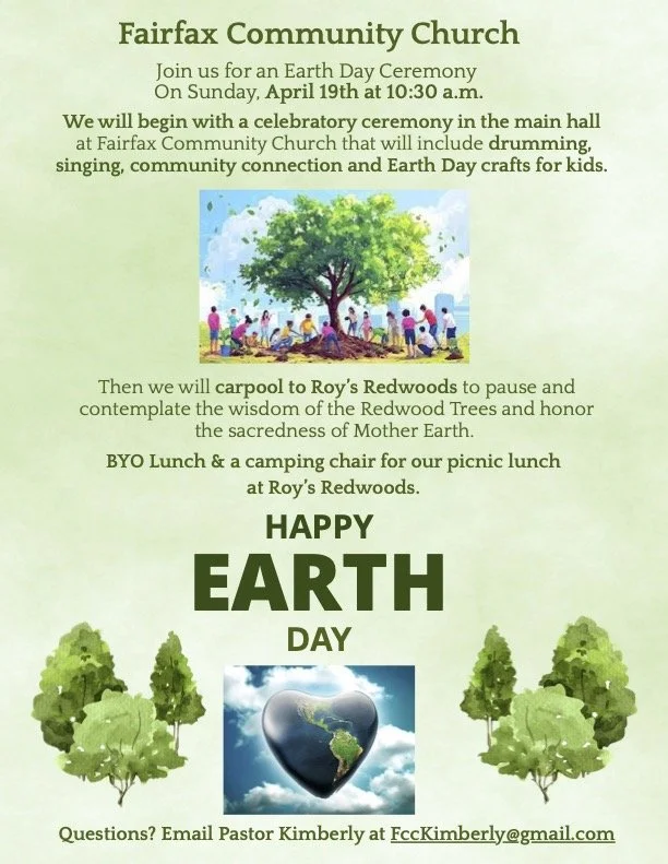 April 19, Special Earth Day Event with activities for kids that will conclude at Roys’ Redwoods - we will gather at the church first for poetry, drumming and a guided meditation and then carpool to Roy's Redwoods for some contemplative time with the trees and a picnic on the benches. BYO Lunch Stay tuned for more details.